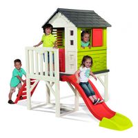 Uroczy domek umieszczony na 70 cm palach, z dwoma oknami z przesuwanymi żaluzjami, drzwiczkami, drabinką do wchodzenia, werandą i zjeżdzalnią o długości 150 cm. Odporna i stabilna konstrukcja. Wysokość 197 cm
