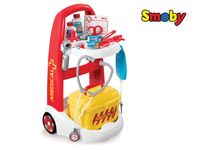 Ten bogato wyposażony zestaw, w skład którego wchodzi: stabilny wózek na kółkach z wygodną rączką oraz walizeczką - kuferkiem, gdzie znajdziemy niezbędne akcesoria w tym: termometr,strzykawkę,plasterki,kroplówkę... w sumie 16 akcesoriów, które pomogą oswoić się ze sprzętem medycznym z jakim dziecko się styka podczas prawdziwych badań lekarskich.