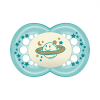 Dzięki specjalnie wyprofilowanej tarczce i szyjce, smoczek MAM Night jest idealnie dopasowany do żuchwy i nie podrażnia skóry dziecka