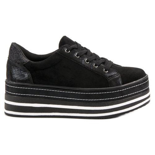 Jedyne w swoim rodzaju sneakersy na grubej platformie to prawdziwa gratka dla kobiet posiadających oryginalny styl. Jest to model, obok którego nie można przejść obojętnie. Podeszwa składa się z kilku biało-czarnych warstw.