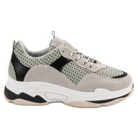 Wykonane z połączenia oddychającego materiału w drobną, szaro białą kratkę z czarnymi wstawkami ze skóry ekologicznej i szarymi aplikacjami z zamszu ekologicznego. Buty na wysokiej, biało czarnej platformie z tworzywa sztucznego porytego ozdobnymi tłoczeniami. Sznurowane, w środku wykończone drobno perforowanym, miękkim materiałem.