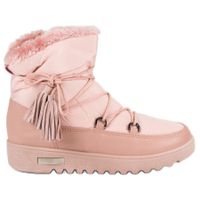 Casualowe śniegowce na 2,5 cm platformie i grubej bieżnikowanej podeszwie, wykonane z wysokogatunkowej skóry ekologicznej i tkaniny tekstylnej. Buty w przyciągającym spojrzenia, różowym kolorze, wykończone wystającym za cholewkę różowym futerkiem. Buty zostały ocieplone futerkiem i wyposażone w futerkowa wkładkę. Śniegowce zostały zaprojektowane z myślą o sezonie jesiennym oraz zimowym.