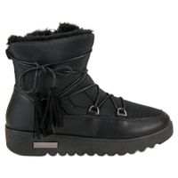 Buty zimowe dla kobiet, wykonane ze skóry ekologicznej i materiału tekstylnego w czarnym kolorze. Buty na platformie o wysokości 2,5cm z podeszwą wykonaną z tworzywa sztucznego z bieżnikiem, dzięki czemu nie tylko chroni przed zimną powierzchnią, ale również przed poślizgnięciami. Model wiązany na sznurówki, ocieplany jest puszystym futerkiem.