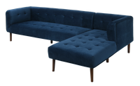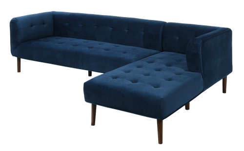 Welurowa sofa narożna Pure w granatowym kolorze. Welurowa sofa prawa o wymiarach 245x153x71cm bez funkcji spania. Siedzisko i oparcie sofy jest sprężyste, dzięki czemu bardzo komfortowe. Minimalistyczna forma sofy wzbogacona o krótkie, drewniane nóżki to pomysł na designerskie wyposażenie wnętrz.