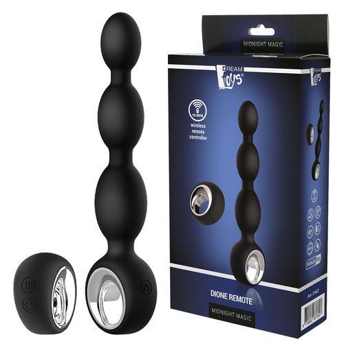 Wibrujący korek, sonda do zabaw analnych z wyjątkowej kolekcji Midnight Magic. Urządzenie składa się z trzech połączonych ze sobą kulek, zakończonych komfortowym uchwytem. Dzięki coraz większym rozmiarom kuleczek, sonda zapewni niesamowite i niespotykane dotąd doznania. Produkt wykonany z miękkiego silikonu medycznego. Świetnie sprawdzi się do zabaw erotycznych solo jak i we dwoje. Kulki analne uruchamia się za pomocą dołączonego do zestawu pilota bezprzewodowego o zasięgu do 10 metrów. Urządzenie wystarczy umieścić w odpowiednim miejscu, a następnie włączyć za pomocą pilota. Dione Remote posiada 1 silnik i 12 trybów wibracji.