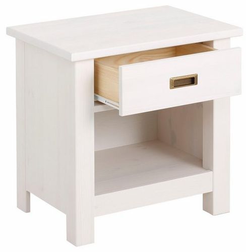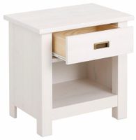 Szafka nocna wykonana z drewna sosnowego, malowana na biało idealnie pasuje do sypialni w stylu rustykalnym. Konstrukcja jest prosta i powściągliwa, dzięki czemu pasuje do różnych łóżek. Szuflada i otwarta komora pomieszczą wszystkie przydatne przybory. Praktyczny zagłębiony uchwyt jest dyskretnym elementem ozdobnym. Metalowe szyny zapewniają łatwe otwierane i zmykanie szuflady. Szafka nocna stanowi idealne uzupełnienie łóżek w stylu rustykalnym. Wymiary: szer/głęb/wys 56/40/54 cm Meble outletowe nowe. Zachodnio-europejski design z najlepszych niemieckich i holenderskich sklepów.