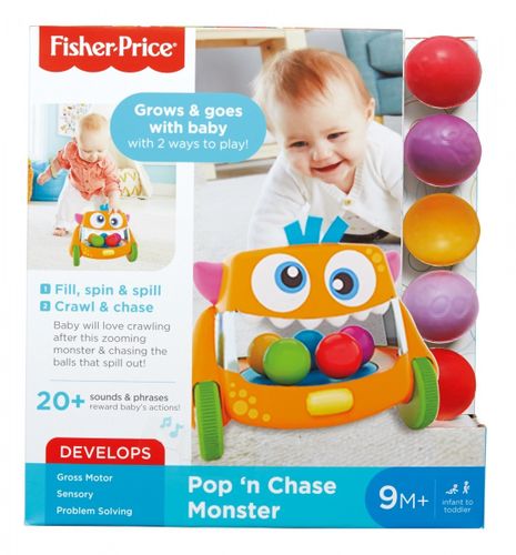 Stworek ucieka, złap go! Fisher-Price(r) Śpiewający Stworek-Kręciołek kręci się, jeździ po pokoju i wyrzuca piłeczki. Stworek umożliwia zabawę na dwa sposoby - zależnie od etapu rozwoju dziecka. Podczas zabawy na siedząco maluch może włożyć do stworka pięć kolorowych piłeczek, a następnie zakręcić wałeczkiem, aby piłeczki kręciły się i wyskakiwały. Zabawę we wkładanie i wyrzucanie piłeczek urozmaicają urocze piosenki i śmieszne wypowiedzi. Gdy dziecko jest gotowe do raczkowania, śmieszny stworek zaczyna szaleć po pokoju, zachęcając malucha do gonienia za nim lub za turlającymi się piłeczkami! Zabawka ma ponad 15 wypowiedzi, piosenek i dźwięków, które zachęcą dziecko do raczkowania.