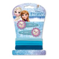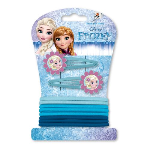 Spinki do włosów Frozen. Wykonane z wysokiej jakości materiału, bardzo praktyczne. Komplet 9-ciu ślicznych gumeczek w różnych odcieniach niebieskiego i dwóch niebieskich spinek z postaciami bohaterów Frozen.