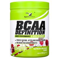 Sport Definition BCAA DEFINITION jest produktem opartym w 100% na najwyższej jakości aminokwasach rozgałęzionych. Jest to jeden z najlepszych produktów tego typu na rynku! Wyróżnia go wysoka koncentracja aminokwasów, świetny smak, brak zbędnych wypełniaczy i dodatków. Zastosowano w nim najlepszy stosunek aminokwasów BCAA 2:1:1 (leucyna : izoleucyna : walina). Istnieje wiele teorii na ten temat i każda proporcja znajduje swoich zwolenników, jednak właśnie ten stosunek ilościowy jest najbardziej naturalnym i jest zbliżony do ich naturalnej ilości występującej w tkance mięśniowej. W związku z tym niesie najwięcej korzyści dla organizmu sportowca!