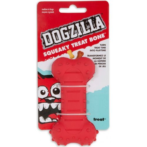 Squeaky Treat Bone to wyjątkowa kość wyprodukowana z wytrzymałej gumy. W jednym końcu kostki znajduje się piszczałka, a drugim schowek na przysmaki. Na powierzchni kostki są specjalne wypustki/bąbelki, które masują dziąsła w trakcie zabawy i pomagają utrzymać zęby w czystości.