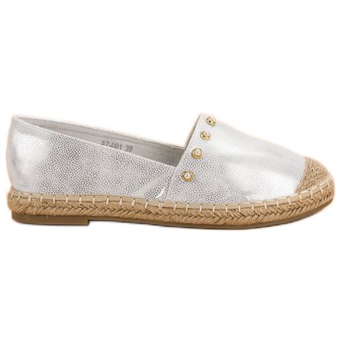 Srebrne espadryle wykonane z lekkiego i miękkiego tworzywa skóropodobnego, ozdobione białymi perełkami. Wygoda, komfort i niepowtarzalny wygląd. Interesujące połączenie stylów. Będą pasowały do wiosennych stylizacji. Płaska podeszwa zapewnia stabilność. Buty są wsuwane, więc ich wkładanie i ściąganie jest szybkie.