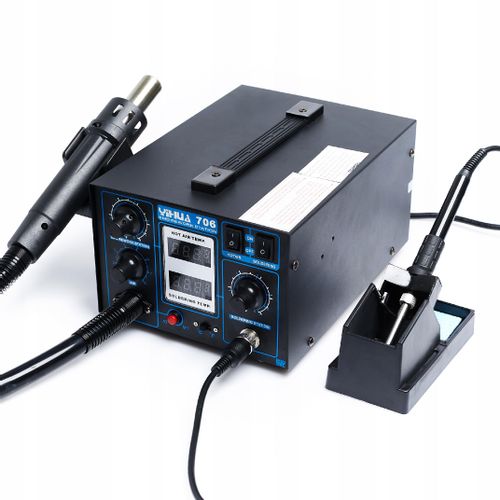 Najnowszy model stacji lutowniczej, Yihua 706 wykorzystuje wiele nowinek technicznych,korzysta z systemu kontroli temperatury Samsung do szybkiego reagowania w czasie rzeczywistym, posiada regulator obu systemów, zarówno lutownicy jak i gorącego powietrza. Stacja 706 to przede wszystkim niespotykana jakość widoczna gołym okiem, urządzenie uniwersalne zarówno dla wymagających jak i średnio zaawansowanych użytkowników w produkcji elektroniki i jej naprawie. Została wyposażona w nowy system nawiewu Hot-Air , dzięki czemu zapewnia on większą elastyczność oraz siłę nadmuchu, zwłaszcza podczas użytkowania dysz z małym otworem, gdzie odprowadzenie ciepła i przepływu jest utrudnione, zastosowanie tych technologi zapewnia dłuższą żywotność i efektywność naszej pracy. Kolba wyposażona jest w specjalnie silikonowe przewody odporne na działanie wysokich temperatur (nawet 300°C) W tym przedziale cenowym będzie to zapewne najlepsze rozwiązanie.