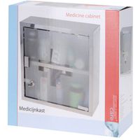 - Stalowa apteczka ze szklanymi drzwiczkami zamykanymi na kluczyk.