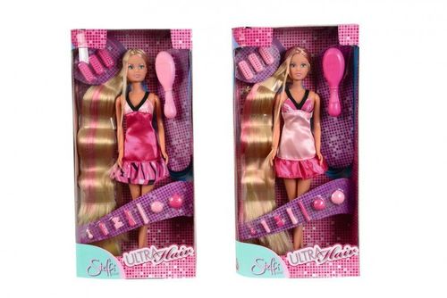 Steffi z bardzo długimi włosami, w błyszczącej sukience. W zestawie znajdują się akcesoria do stylizacji włosów.