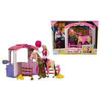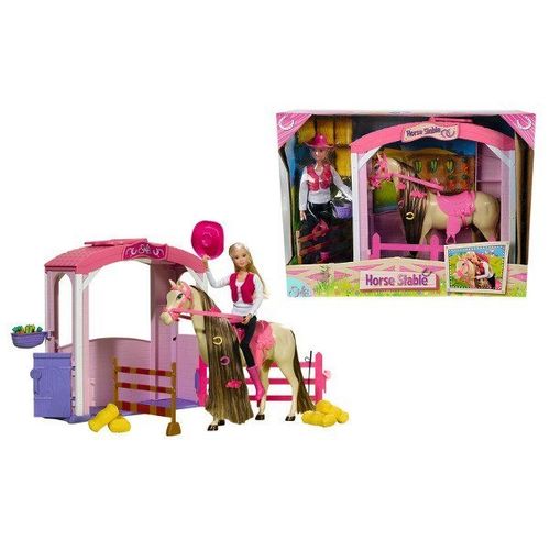 W zestawie koń z długą grzywą, stajnia oraz wiele akcesoriów.