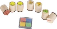 W zestawie znajdziemy 7 stempelków z wzorem koniczynka, buźka uśmiechnięta, buźka smutna, buźka poważna, kciuk do góry, kciuk do dołu i ptaszek odznaczenia oraz tuszownik w czterech kolorach: żółtym, pomarańczowym, niebieskim oraz zielonym.