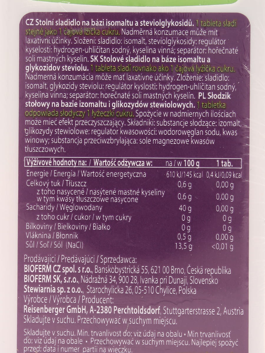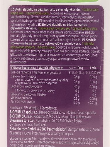 w 1 tabletce Wartość energetyczna - 0,5 kJ / 0,12 kcal Białko - 0 g Węglowodany - 0 g Tłuszcz - 0 g | | | | | | Stosowanie: | |  | | 1 tabletka odpowiada 1 kostce cukru | | | | | | Opakowanie: | |  | | 300 tabletek | | | | | |  | |