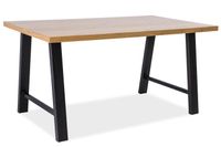 ABRAMO 150 firmy SIGNAL to uniwersalny stół, który nadaje się do każdego wnętrza. Solidny blat w naturalnej okleinie w kształcie prostokątnym oraz metalowe nogi układające się pod skosami nadają mu niebanalnego wyglądu. Metal i drewno współgrają ze sobą, co widać na zdjęciach, w dodatku kolor dębu z czernią nóg pięknie kontrastuje dając wspaniały efekt wizualny. Mebel ma solidne wymiary, dzięki czemu pomieści sporą liczbę osób. Do tego stołu dobrze dobrane krzesła spełnią funkcję dopełnienia całości i nadadzą zestawowi nietuzinkowego wyglądu.