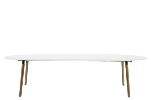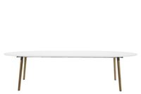 Stół rozkładany Belina został wykonany z lakierowanego na biało drewna i solidnej podstawy z drewna dębowego na metalowych, chromowanych wzmocnieniach. W zestawie są dwa dodatkowe blaty o wymiarach 50x100cm każda. Stół nie posiada dodatkowej półki pod blatem.