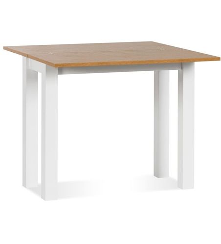 Uniwersalny stół rozkładany. Blat płyta laminat kolor dąb naturalny, stelaż drewno kolor biały. Blat po rozłożeniu ma wymiar 80x80 cm. FLIP-FLOP jest wspaniałym stołem który nie tylko fantastycznie się prezentuje ale jest również bardzo trwały.