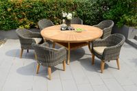Efektowny, duży okrągły stół dla wymagających. Wykonany został z drewna tekowego pozyskanego z Indonezyjskich lasów z certyfikatem FSC. Szlachetny urok drewna podkreśla rustykalny charakter wykończenia. Oryginalnym elementem jest rotacyjny środek. Posiada otwór na parasol i wygodną półkę na drobiazgi. Luksusowy charakter stołu mogą podkreślić fotele Guam, które polecamy do kompletu.
