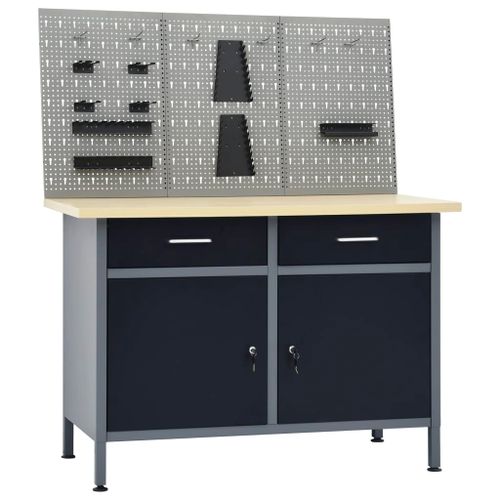 Zestaw ten łączy 1 stół roboczy i 3 panele ścienne, stanowiąc praktyczne rozwiązanie kwestii przechowywania w warsztacie lub garażu.