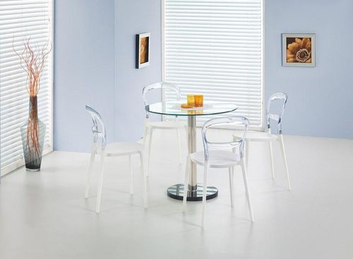 Cyryl to niezwykły szklany stół, który posiada stelaż ze stali chromowanej, świetny do nowoczesnego pokoju dziennego lub do jadalni. Stół posiada blat ze szkła bezbarwnego. Produkt ten to współczesny stół firmy Halmar. Do stołu Cyryl można dobrać krzesła K100 lub (widoczne na zdjęciu), które idealnie będą komponowały się ze stołem i będą stanowiły zestaw.