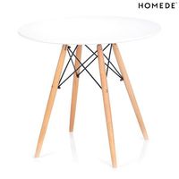 | Stół TEBE Materiał: płyta MDF (blat), metal (rama), drewno bukowe (nogi) Kształt: okrągły Średnica blatu: 85 cm Wysokość: 70 cm Kolor blatu: biały Kolor nóżek: naturalny Ilość nóżek: 4 Marka: Homede Dodatkowe informacje: do zestawu dołączono akcesoria montażowe oraz czytelną instrukcję. |