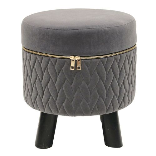 Stołek Soya został wykonany ze stylowej welurowej tkaniny. Szary kolor siedziska idealnie komponuje się z czarną podstawą. Elegancji ławce dodaje ozdobny metalowy suwak w kolorze złotym. Nogi stołka wykonane są z drewna oraz zostały pomalowane na matowy czarny kolor. Wysokość: 37cm, szerokość: 32cm, głębokośc: 32 cm.