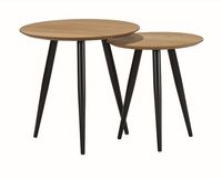 Zestaw dwóch stolików. Blat wykonany z MDF-u dędowy. Nogi wykonane ze stali w kolorze czarnym. Grubość blatu: 1,8 cm Maksymalna ilość szt. w opakowaniu: 1 Sposób wysyłki: Paczka Produkt do samodzielnego montażu: Tak Wymiary: Większy: średnica: 50cm, wysokość: 50cm Mniejszy: średnica: 40cm, wysokość: 45cm Wymiary paczki: 75*62*8 Waga :8 kg