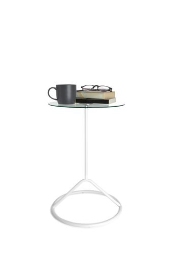 Ten stolik nie zajmie w salonie wiele miejsca! Oryginalny, umieszczony,na jednej nóżce, która kończy się okrągłą podstawą i pozwala swobodnie wyciągnąć pod stolikiem nogi. Szklany blat wieńczy dzieło! Wersja w kolorze niklu. Wysokość: 56