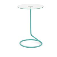Ten stolik nie zajmie w salonie wiele miejsca! Oryginalny, umieszczony na jednej nóżce, która kończy się okrągłą podstawą i pozwala swobodnie wyciągnąć pod stolikiem nogi. Szklany blat wieńczy dzieło! Wersja w kolorze niebieskim. Wysokość: 56 cm Szerokość: 38 cm Głębokość: 38 cm