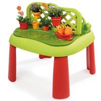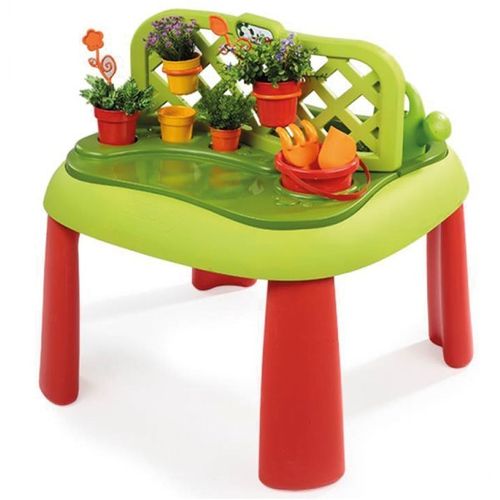 Posiada 2 blaty: 1 ze zbiornikiem, 1 do pracy, z pokrywami. W zestawie: 1 kratka z 2 doniczkami,1 łopatka, 1 grabki, donice kwiatowe, 5 doniczek, 4 rekwizyty, 1 wiaderko, 1 konewka. Powłoka ANTI-UV chroniąca przed słońcem.