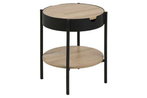 Stolik Tipton Small to połączenie płyty melaminowej z fakrurą dębu i matowego metalu malowanego proszkowo. Pod blatem ukryta jest półka, w której możesz schować swoje skarby lub inne przedmioty. Pod blatem znajduje się również półka, która dodaje funkcjonalności. Całość wygląda rustykalnie i estetycznie.