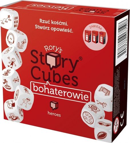 Story Cubes: Bohaterowie są zestawem w którym odnajdziemy dodatki 3 kostkowe: Supermoce, Sport i Salon gier. Posiadają 54 ikonki , które pozwalają wprowadzić do naszych opowieści rozmaitych bohaterów zarówno tych obdarzonych niezwykłymi zdolnościami, jak i nieco bardziej zwykłych i codziennych.