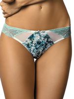 Stylowe stringi w niepowtarzalnym, kremowo-turkusowym kolorze. Ślicznie zestawione z piękną, kwiecistą tkaniną. Pośladki również otulone koronką. Nowość od Gorteks.