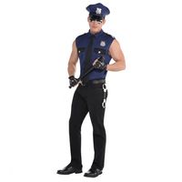 Strój wykonany z tkaniny poliestrowej, elastyczny materiał. Koszula bez rękawów w kolorze granatowym zapinana na guziki. Czapka z daszkiem z regulowanym obwodem ze srebrną odznaką. Kostium uzupełnia czarny krawat, rękawiczki bez palców z materiału przypominającego skórę i metalowa odznaka policyjna z napisem COP. Kostium wysokiej jakości renomowanej marki Amscan.