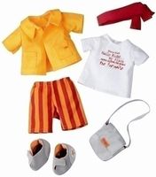 Kolorowe 7 częściowe ubranko dla lalek firmy Haba o wysokości 34 - 38 cm. W skład zestawu wchodzą: torba, kurtka, spodenki, koszulka, buciki oraz opaska na głowę. Cena dotyczy wyłącznie ubranka.