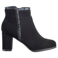 Eleganckie botki Weide wykonane z czarnej, zamszowej ekologicznej skóry. Posiadają obcas typu słupek o wysokości 7,5 cm. Buty zostały ozdobione modną lamówką. Botki są zapinane na zamek oraz mają miękki i zabudowany zapiętek. Przeznaczone są na sezon jesienno-zimowy, doskonałe do codziennego chodzenia.