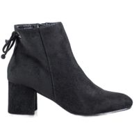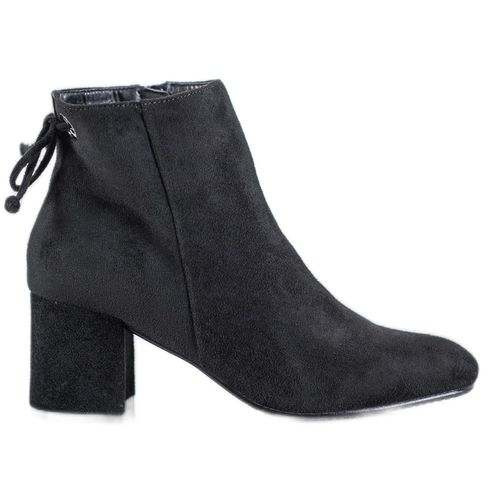 Kobiece i bardzo eleganckie botki damskie w kolorze ponadczasowej czerni. Buty zostały wykonane z wysokiej jakości zamszowej skóry ekologicznej. Zamek błyskawiczny znacznie ułatwia zdejmowanie i zakładanie obuwia. 6.5-centymetrowe obcasy na słupku zapewniają komfort oraz stabilność w trakcie chodzenia.