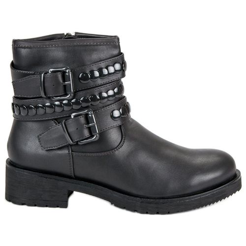 Szare stylowe botki workery Butymodne wyróżniają się przede wszystkim modnymi paskami, na których widnieją liczne dżety. Buty te posiadają suwak oraz obcas o wysokości 4cm. Wykonane zostały z ekologicznej skóry. Model ten jest komfortowy, dzięki swojemu wykonaniu oraz wysokości. Są to też buty uniwersalne, świetne na wiele okazji.