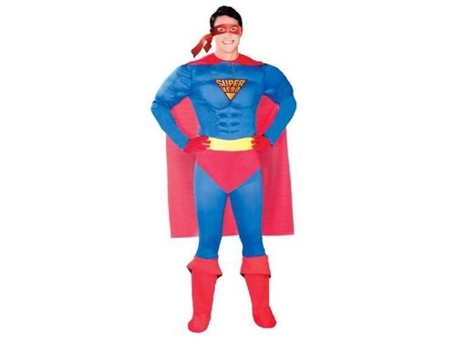 Strój zawiera:niebieski kombinezon z nadrukiem Super Hero, żółty pasek oraz czerwoną pelerynę