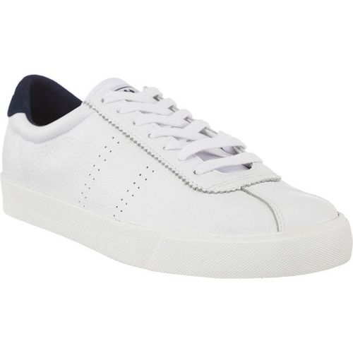 Skórzane, wysokogatunkowe trampki w stylu retro!Inspirowane stylem tenisowym, trampki Superga 2843 Comfleau to świetna propozycja w stylu retro. Trampki maja skórzaną cholewkę z perforacjami, logowany język i przód buta wzmocniony dodatkowym panelem ze skóry. Detale są granatowe - w tym kontrastującym kolorze jest podeszwa buta, wnętrze i zapiętek. Podeszwa zewnętrzna z wulkanizowanej gumy zapewnia maksymalną przyczepność do podłoża, a cholewka umożliwia swobodny ruch kostki i stopy. Marka Superga istnieje od 1911 roku. Wtedy brand zaczął produkować buty z podeszwami z gumy wulkanizowanej. To właśnie w Turynie, we Włoszech narodziły się pierwsze, klasyczne trampki Superga. Dziś to popularne obuwie miejskie, które przeżywa drugą młodość! Skórzana cholewka w białym kolorzeGranatowo-niebieskie detale i wnętrze butaWzmocniony skórzanym panelem nosekPrzyczepna podeszwa z wulkanizowanej gumy Komfortowa, miękka wkładkaPerforacje w cholewceWygodne sznurowanie