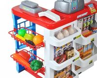 Zestaw zawiera kasę, w której można dużym przyciskiem zmieniać kwoty oraz otwierać szufladkę (w zestawie także zabawkowe pieniążki papierowe). Dodatkowo, w zestawie znajduje się skaner, który po wciśnięciu przycisku świeci na czerwono jak laser i wydaje charakterystyczny dźwięk, jak w prawdziwym sklepie!