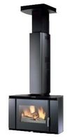 Kominek podwieszany w formacie 16:9. Fasada kominka oszklona. Palenisko wykonane z żeliwa.