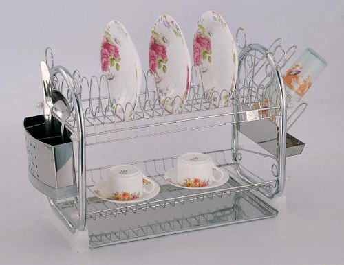 Dwupoziomowa suszarka do naczyń z ociekaczem. Suszarka wykonana jest z drutu chromowanego. Z boków suszarki jest zdejmowany koszyczek na sztućce i wieszaki na kubki. Na dole znajduje się metalowa chromowana tacka która zbiera wodę ściekającą z naczyń. Tackę można wyjąc i umyć.