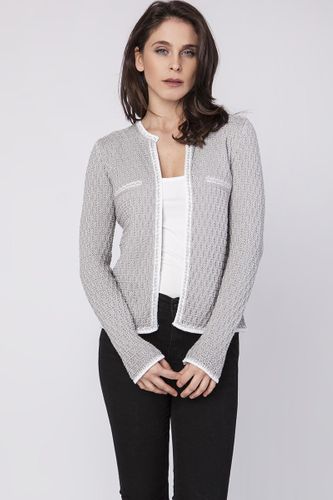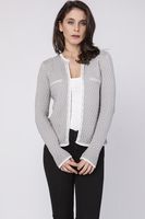 Kardigan o klasycznym kroju ala Chanel, ozdobiony kontrastową lamówką i wstawkami imitującymi kieszenie. Ciekawa faktura w połączeniu z prostą formą tworzą ponadczasowy duet, który sprawdzi się zarówno w biurze, jak i podczas eleganckiej kolacji.