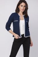Kardigan o klasycznym kroju ala Chanel, ozdobiony kontrastową lamówką i wstawkami imitującymi kieszenie. Ciekawa faktura w połączeniu z prostą formą tworzą ponadczasowy duet, który sprawdzi się zarówno w biurze, jak i podczas eleganckiej kolacji.