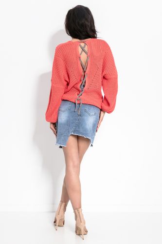 Luźny sweter z dekoltem w serek, na tyle ozdobiony przeplecionym sznurkiem. Pozwala na odrobinę nonszalancji w wiosennych stylizacjach.