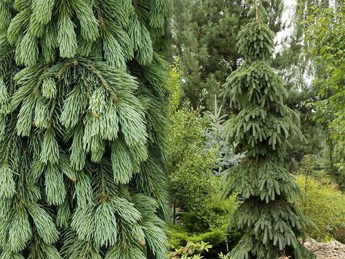 Świerk o wąskim, kolumnowym pokroju i "płaczących" pędach. W wieku 10 lat osiąga około 2-3 m wysokości przy 0,5 -1 m średnicy. Stare egzemplarze mogą dorastać nawet do 12 m. Wytwarza jeden prosty pęd przewodni, który nie zanika i pnie się do góry. Pędy mocno przewisające, przylegające do pnia, dzięki czemu świerk ten ma ładny, zwarty i gęsty pokrój. Młode igły są jasnozielone, później przybierają barwę niebiesko-zieloną. Roślina wytwarza małe, jasnobrązowe szyszki.